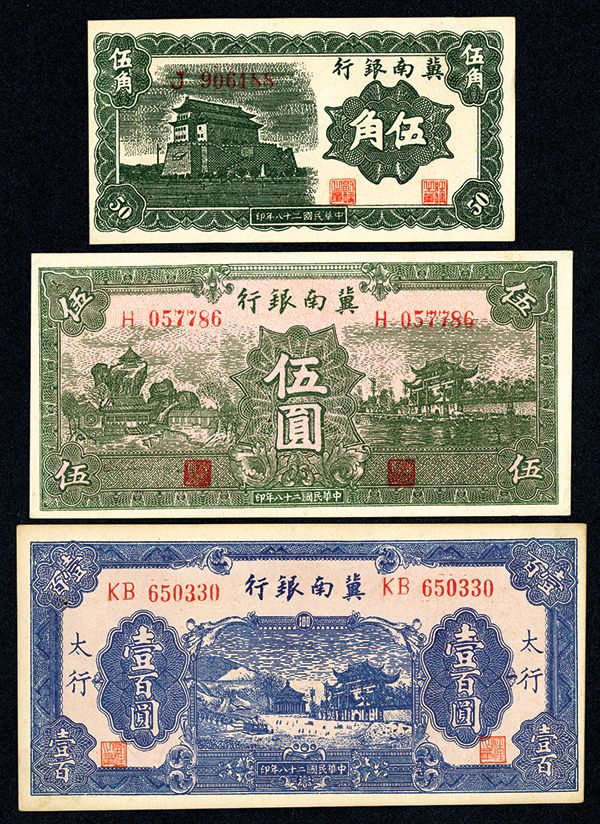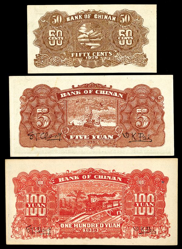 China, Lot of 3 notes, All are 1939 issues, Includes 50 cents, P-S3066, Unc. to CU; 5 Yuan, P-S3069, Unc. to CU; 100 Yuan, P-S3070Fb, Unc. With a small pin hole, Rare note in any condition, attractive banknote trio.