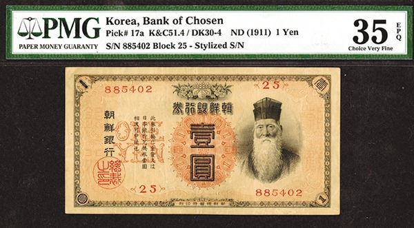 Korea. 1 Yen. P-17a. Man with beard at right end. Block 25. Graded PMG Choice Very Fine 35 EPQ.