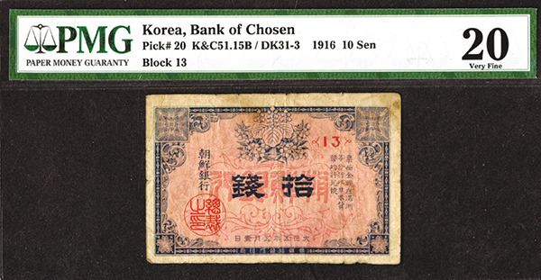 Korea. 10 Sen. P-20. K&C51.15B / DK31-3. Taisho yr. 5. Block 13. Blue on rose underprint. PMG Graded Very Fine 20, previously mounted notation.