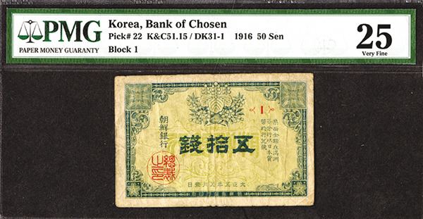 Korea. 50 Sen. P-22. K&C51.15 / DK31-1. Taisho yr. 5. Block 1. Green on light green underprint. PMG graded Very Fine 25.