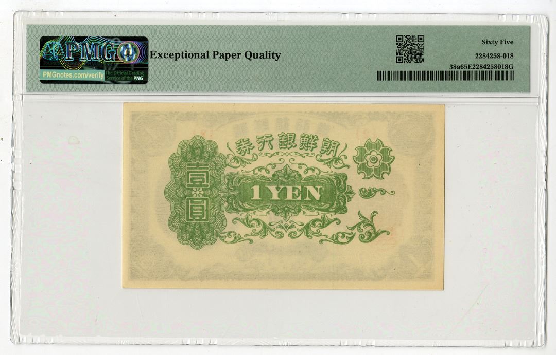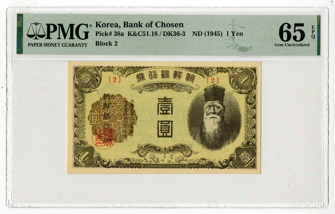 Korea, ND (1945). 1 Yen, P-38a K&C51.18/DK36-3, Issued Banknote, Black on yellow underprint with portrait of man at right, Block 2, PMG graded Gem Uncirculated 65 EPQ.