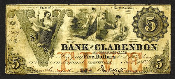 Fayetteville, NC, $5, Haxby NC15-G2a, Issued Obsolete, Black on red underprint, S/N 7497, VG, DWC. Attractive note.