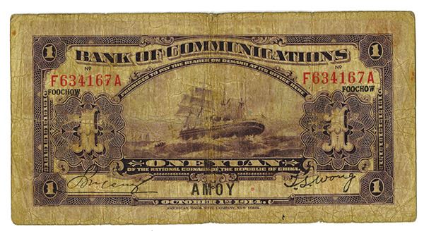China. 1914. 1 Yuan. P-116w. (S/M #C126-60a). Issued banknote. Locomotive in ravine, brown and m/c on face, back with steamship in rough seas, brown. Fine to Almost VF condition. Rare note in any condition. ABNC. Priced in SCWPM at $400 in good condition and only one other example is listed in the PMG census in similar condition and it may be this example.
