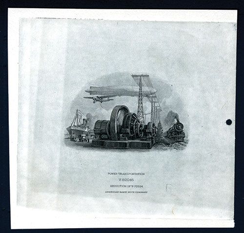 ND (ca. 1940-41), 4.5 x 4.5 inches, printed in black on india paper, vignette of Zeppelin-Airplane-Power Generator-Locomotive-Steamship used on 25 Yuan, P-160 Bank of communication note, Legend on bottom states “Power Transportation - V-82046 - - Reduction of V-70534 - American Bank Note Co.”, Uncirculated. Rare production proof from this popular banknote series. ABNC.