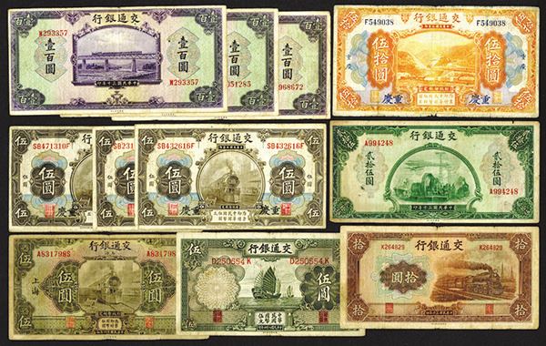 China, 5, 10, 25, 50, 100 Yuan. Includes: P-117e Chungking (3) Steam train at center; 119a Chungking, Mountain landscape at center; 146B Shanghai Steam train at center; 154a Junks at center; 159a Steam train at right; 160 Electric generator at center; 162b (3) Steam train at center. Generally Very Good, some with hand stamps, graffiti or paper damage. 11 pieces.