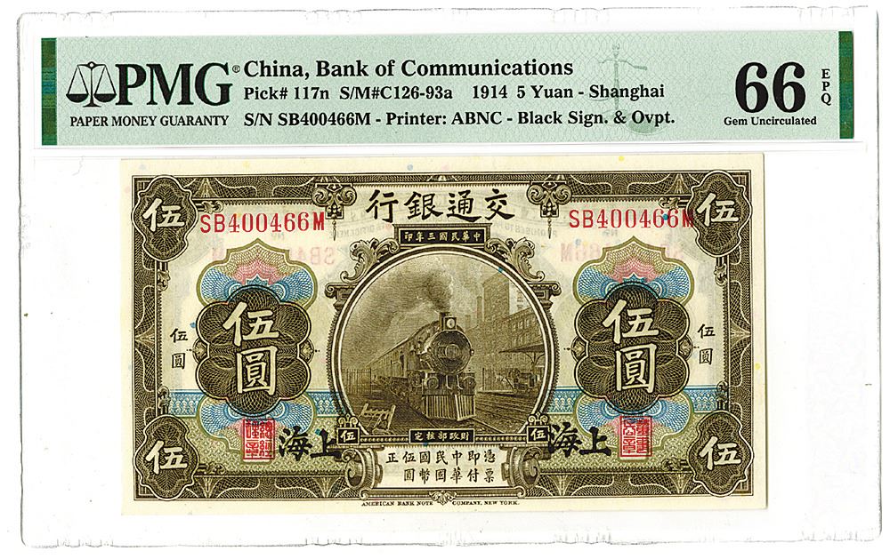 China. 1914. 5 Yuan, P-117n, S/M#C126-93a, issued banknote, Shanghai, black sign. & ovpt., PMG Graded Gem Unc 66 EPQ, ABNC.