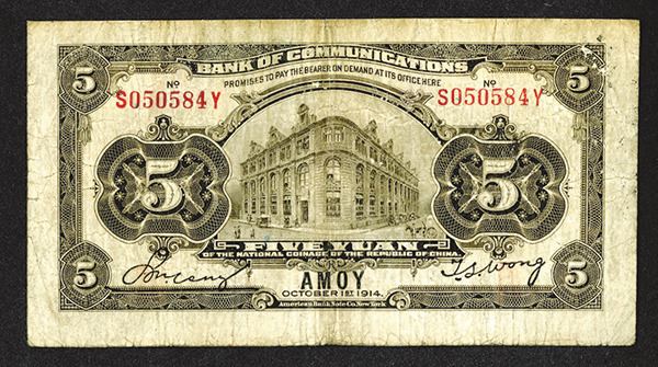 China. 5 Yuan. Amoy. P-117a. Bold steam locomotive vignette. Nice Fine.