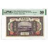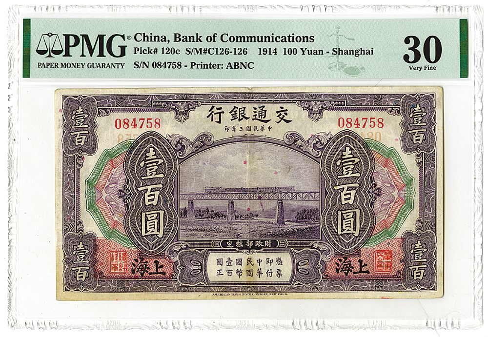 China. 1914. 100 Yuan, P-120c, S/M#C126-126, issued banknote, Shanghai, Train over bridge in middle, back purple with locomotive facing 3/4 forward, PMG Graded Very Fine 30 with comment "Stained", ABNC.