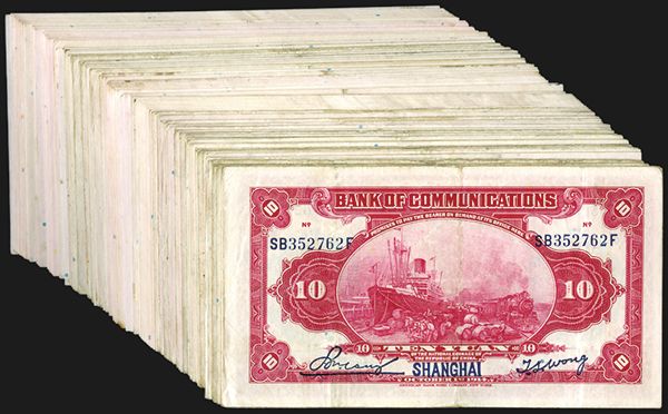 Shanghai, China. Lot of 140 pieces, All are 10 Yuan, P-118q, S/M#C126-115b, Issued banknotes, overprinted in blue-black signatures and place, Choice Fine to Uncirculated, please inspect, Sold "As Is", no returns. ABNC.