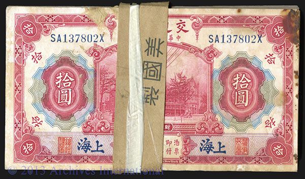 China, $10, P-118p, S/M#C126-115a, Pack of 99, some with water damage and staining, Includes S/N SA 137888 X. Useful AU-Unc. Pack, ABNC. Please inspect.
