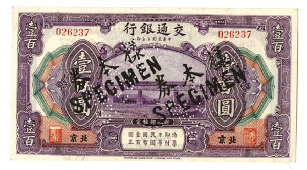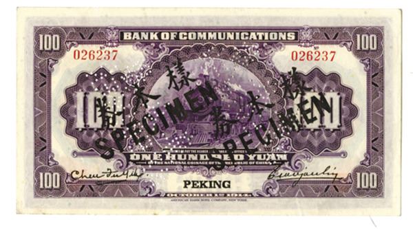 Peking, China, specimen 100 Yuan, P-120fs, overprinted "SPECIMEN" in black, S/N 026237, Extremely Fine to About Uncirculated. ABNC.