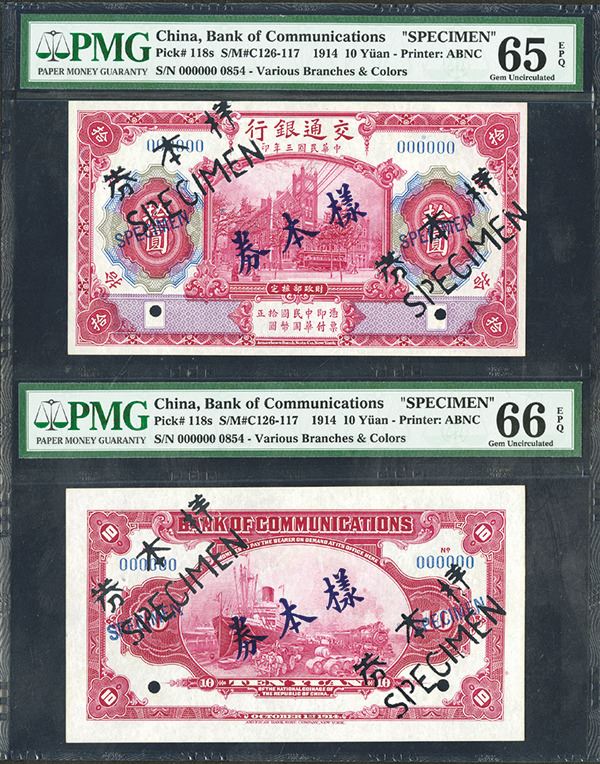 China, 10 Yuan, P-118s S/M#C126-117, Uniface specimen pair, Red, Bank building on top middle, blue and black English and Chinese Specimen Overprints and Punched out letters, Both front and back are PMG graded Gem Uncirculated 65 EPQ, backs have blue specimen overprints and blue handstamps dated 1936, Rare notes in this format and very attractive. ABNC.