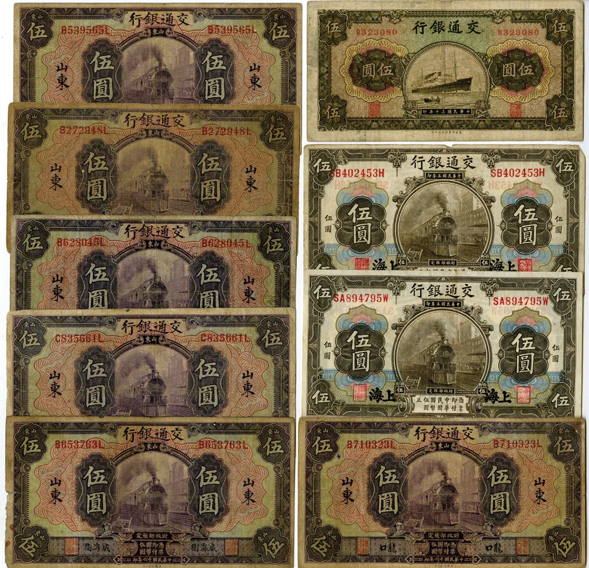 China, 1927. Lot of 9 Issued Banknotes, Includes: 5 Yuan, 1914, P-117o (2) S/M#C126-93, Shanghai Branch, ABNC, VF; 1927, 5 Yuan, P-146Ca, Shantung, English Signature; 5 Yuan, P-146Cb, Chefoo/Shantung, English and Chinese Signatures; 5 Yuan, P-146Cc, Lungkow/Shantung, English and Chinese Signatures; 5 Yuan, P-146Cd, Tsinan/Shantung, English and Chinese Signatures; 5 Yuan, P-146Ce, Tsingtau/Shantung, English and Chinese Signatures; 5 Yuan, P-146Cf, Weihaiwei/Shantung, English and Chinese Signatures; and, 1941, 5 Yuan, P-157a, S/M#C126-251, CMPA. Notes range from Fine to VF+ condition. All of the Branch Issues are rare. Only 3 notes have been graded for the Chefoo/Shantung branch; 13 notes for the Lungkow/Shantung branch; 7 notes for the Tsinan/Shantung branch; 17 notes graded for the Tsingtau/Shantung Branch; and 3 notes graded for the Weihaiwei/Shantung Branch. All are rare in any condition with very few appearance at auction. This is an opportunity to acquire all of these rarities at one time. (9).