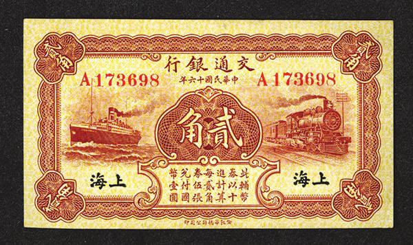 Shanghai, China, 1927, P-143b (S/M#C126-183b), Issued banknote, Red-brown on light yellow undertint with steamship and locomotive, back blue, Choice XF to AU condition with large margins, bright colors and firm paper quality with one light vertical fold keeping this note from Choice AU to Uncirculated. W&S.