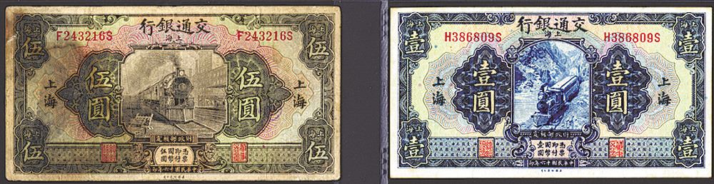 Shanghai, China. 1927. Lot of 2 notes, Includes China, 1 Yuan, P-145Ac (S/M#C126-193), Issued banknote, blue on m/c with train, back blue, PMG graded Choice Very Fine 35 NET with note of paper clip rust on back, attractive note for issue and 5 Yuan, P-146B (S/M#C126-203), Issued, PMG graded Choice Fine 15 NET with note of stains, scarce banknote pair, ABNC. (From the Allen Berk Collection)