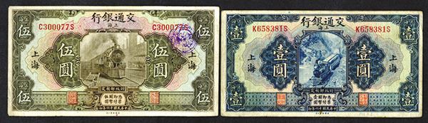 China. 1, 5 Yuan. P-145Ac; 146B. S/M C126-193; C126-203. Steam passenger train vignettes. Nice Very Fine, first with a small tone spot, second with ink hand stamps. 2 pieces.