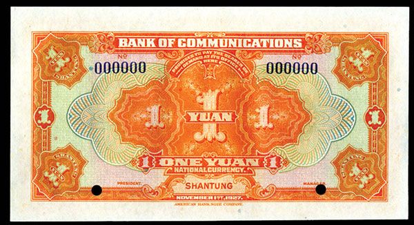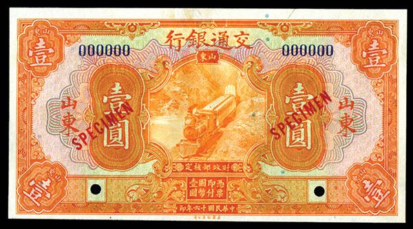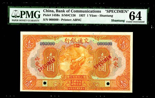 Shantung, China, 1927, 1 Yuan, P-145Bas, (S/M #C126-194), Specimen banknote, Orange on m/c with locomotive through gorge in middle, back orange. Specimen overprints, "00000" serial numbers and POC's. PMG graded Choice Uncirculated 64. ABNC.