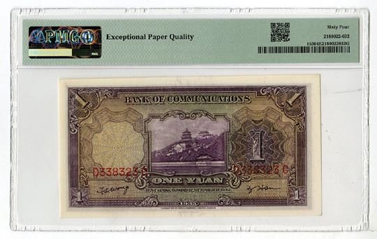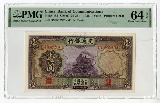 China, 1935. 1 Yuan, P-153 S/M#C126-241, Issued Banknote, Purple on m/c with locomotive at center, back is purple on m/c, S/N D338323C, PMG graded Choice Uncirculated 64 EPQ, TDLR.