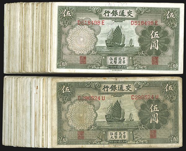 China, Lot of 100 banknotes, all are 1935, 5 Yuan, P-154a, Dark green, junks at center, mostly VF with some higher. TDLR. (100)