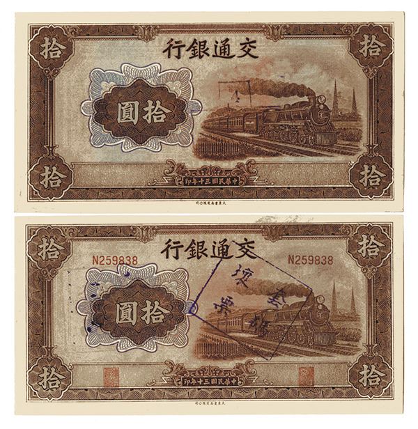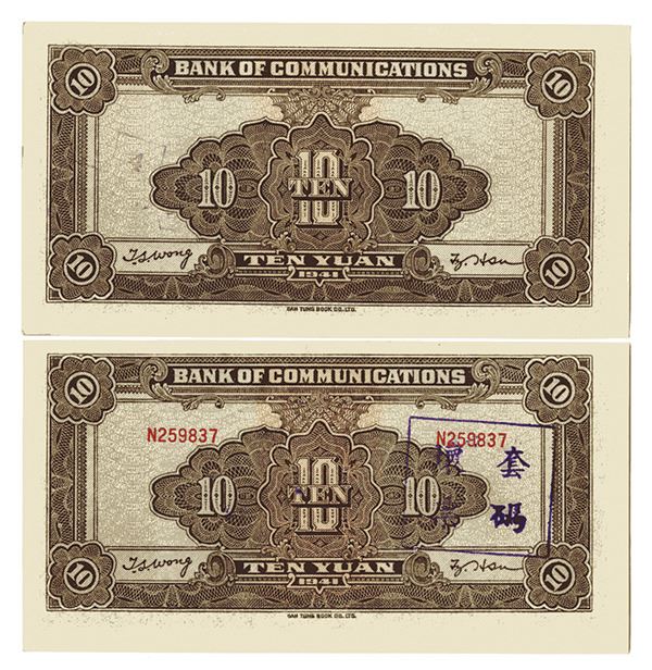China, Lot of 2 notes, Both are 10 Yuan, P-159, one with mismatched serial numbers on face and back and the second without serial numbers. Both in Uncirculated Condition. Dah Tung Book Co.