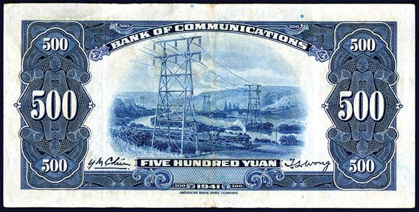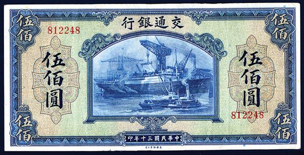 China, 500 Yuan, P-163a, S/M#126-263, Issued banknote, blue on m/c, front with ship at dockside, back with locomotive under power lines, S/N 812248, Choice VF to XF with a very light vertical middle fold and light handling on the top margin, Bright colors, excellent centering, large margins and sharp corners enhance this attractive note. ABNC.
