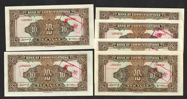 China. 10 Yuan. P-159d. S/M C126-254. Steam train at right end. Mis-Matched serial #. Consecutive. With hand stamp CANCELLED. Choice Uncirculated. 6 pieces.