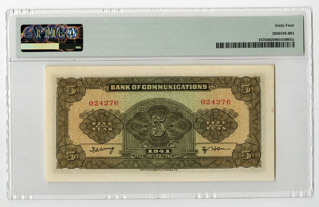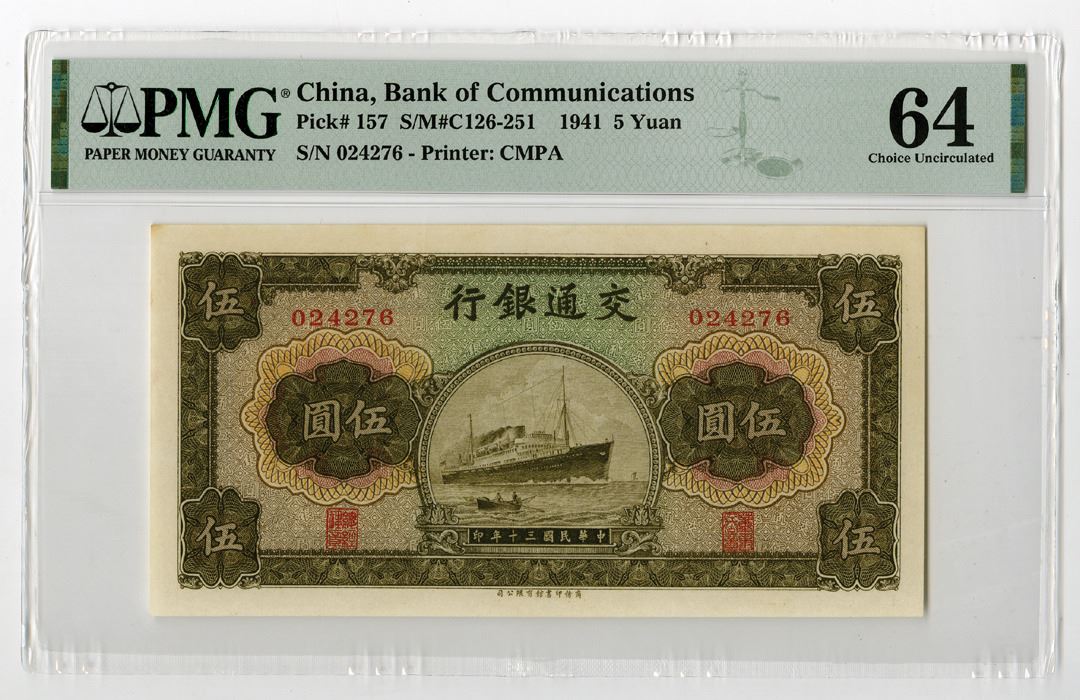 China. 1941. 5 Yuan, P-157 S/M#C126-251, Issued banknote, Olive green on multicolor underprint, S/N 024276, PMG graded Choice Uncirculated 64. Printer: CMPA.