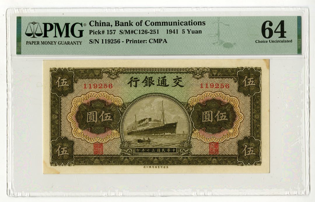 China, 1941. 5 Yuan, P-157 S/M#C126-251, Issued Banknote, Brown on m/c underprint with ship at center, S/N 119256, PMG graded Choice Uncirculated 64 with comment "Corner Stain," CMPA