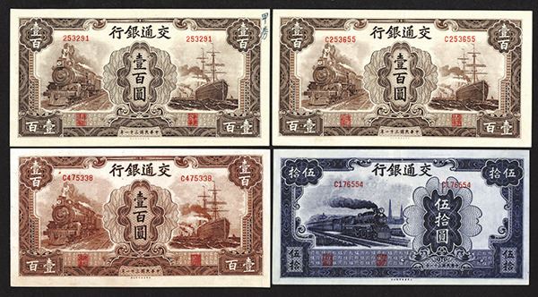 China. 50, 100 Yuan. SCWPM 164a (purple), 165 (3, two with slightly different brown tone, and small back plate size). Generally Very Fine with the appearance of better one of the latter with ink graffiti. 4 pieces.