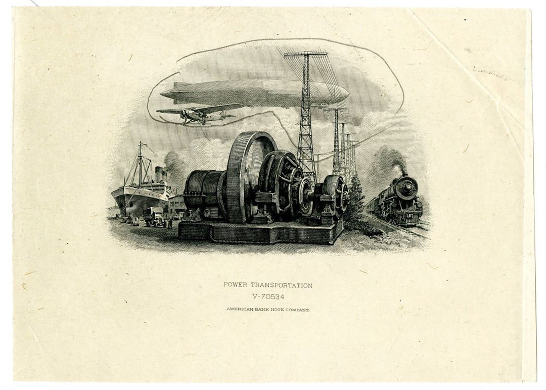 China. ABN Proof Vignette "Power Transportation" Used on Bank of Communications, 1941, 25 Yuan Proof Vignette. Intaglio CU Black ABN. LDP Proof Vignette printed on india paper that is unmounted. "Power Transportation, V-70534" imprint on bottom, Printed by ABNC.