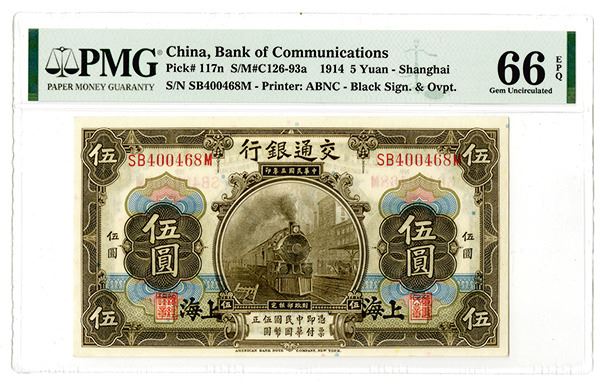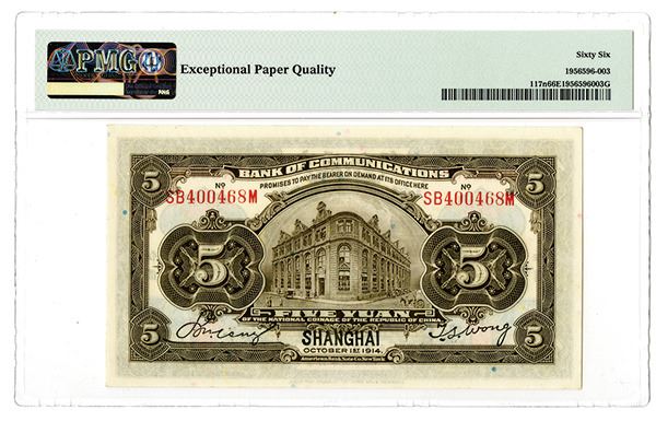 China. Issued 5 Yuan, 1914, P-117n S/M#C126-93a. PMG graded Gem Uncirculated 66 EPQ (Cert # 1956596-003). ABNC.