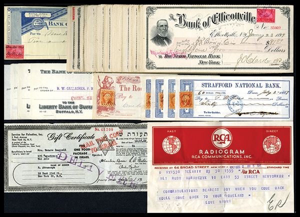 Bank of Ellicottville Checks and other items. Bank of Ellicottville large format checks 1890s, man’s portrait, revenues, issued, neatly cancelled, VF-EF mostly(43); also included are some additional assorted checks and other papers. [50+]