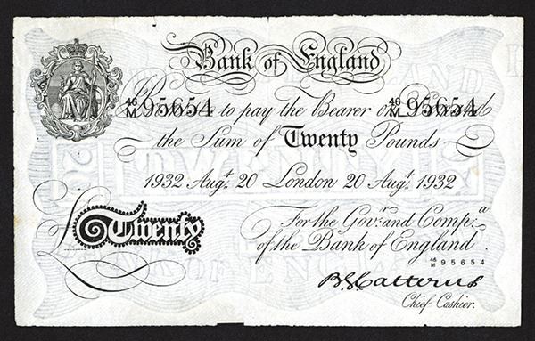 Great Britain. 20 Pounds. P-330 this serial # combination - 46 /M 95 is not recognized as an Operation Berhnard note. Choice Very Fine.