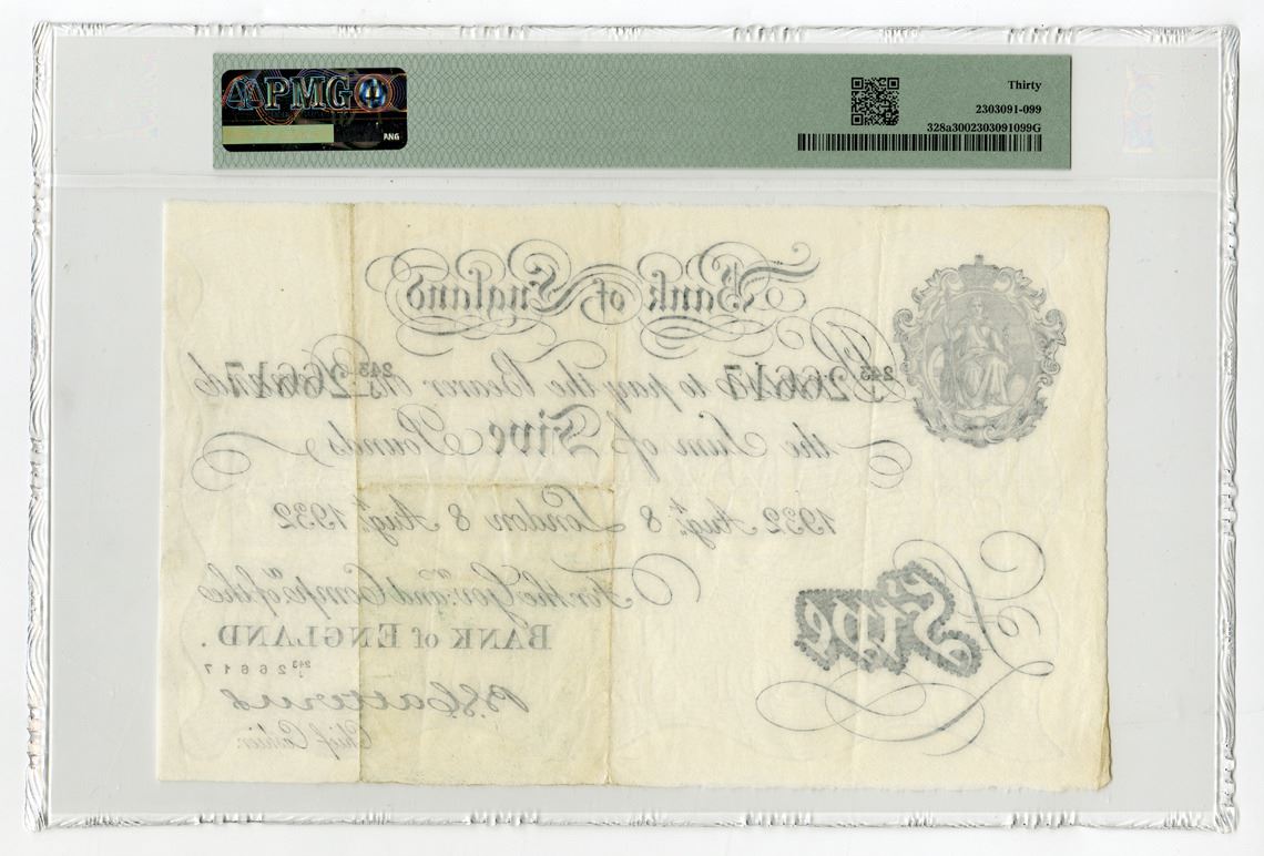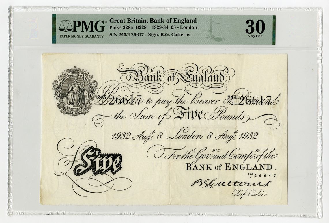 London, England, Great Britain, 1932. 5 Pounds, P-328a B228, Issued Banknote, Black printing with Britannia at top left corner, Uniface note, S/N 243/J 26617, PMG graded Very Fine 30.