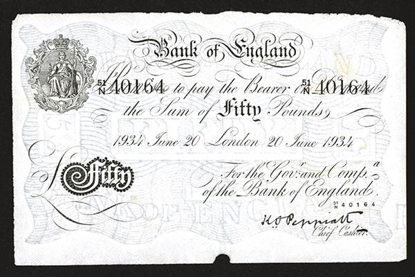Great Britain. 50 Pounds. P-338 for type, but this serial # combination - 51/N 40… is recognized as an Operation Bernhard forgery. Slight paper tone, clip at bottom center edge. Choice Extremely Fine.