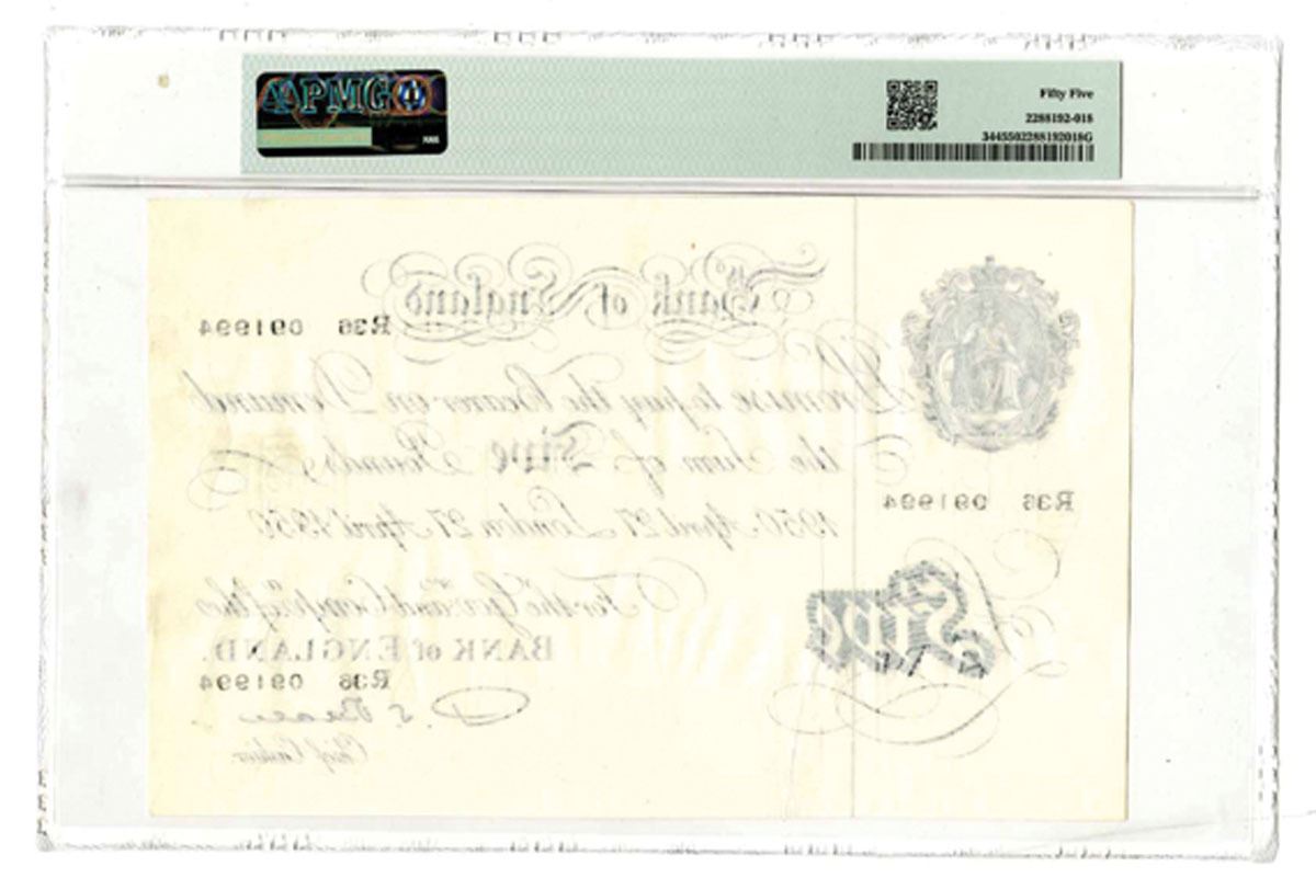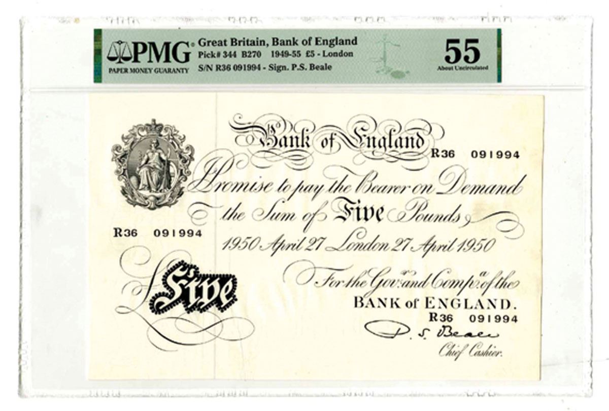 Great Britain, 1950. £5, P-344 B270, Issued Banknote, Black printing with seal of England at left, S/N R36 091994, Signature of P.S. Beale. PMG graded About Uncirculated 55.