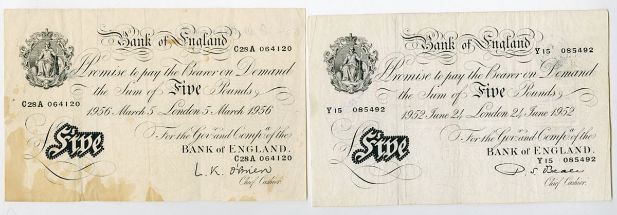 Great Britain. Lot of 2 issued £5 notes, Includes June 24, 1952, P-344, Choice Fine to VF with light stains; and, 5 March 1956, P-345, Very Fine condition. Both with handstamps and endorsements on back. (2)