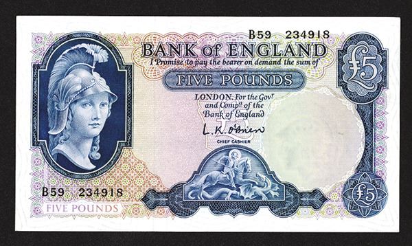Great Britain. 5 Pounds. P-371a. O'Brien signature, L5 on back in black. Choice Uncirculated.