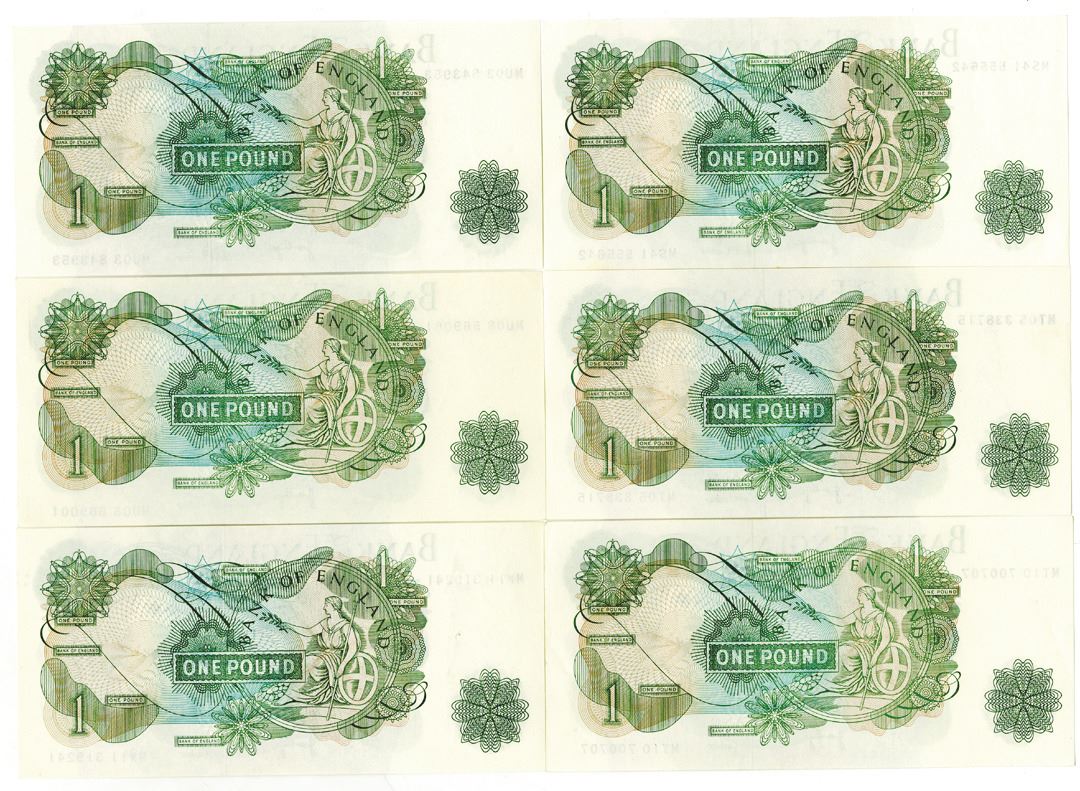 Great BritainÉ Group of 6, £1 Pound Replacement Notes, ND (1960-1978), P-374g, J.B. Page signature, Deep green on m/c underprint, Portrait of Queen Elizabeth II at right, back shows Britannia seated with shield in circle at center right. 2 notes are Choice AU and 4 notes are Uncirculated to CU or better. (6). (Arthur C. Matz Collection)