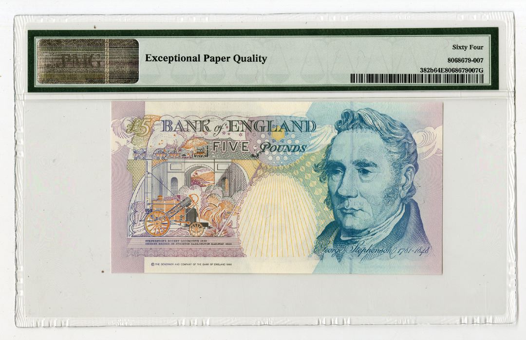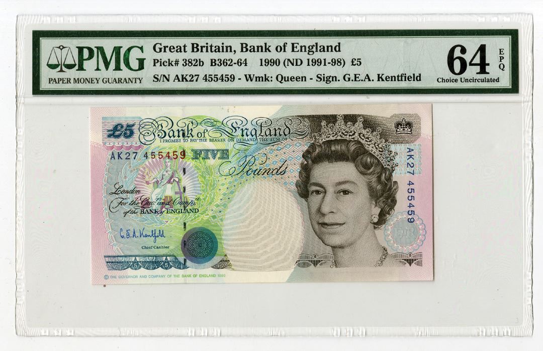 Great Britian, 1990 (ND 1991-98). 5 Pounds, P-382b B362-64, Issued Banknote, Blue with green and pink on m/c underprint, Portrait of Queen Elizabeth II at right, S/N AK27 455459, PMG graded Choice Uncirculated 64 EPQ.