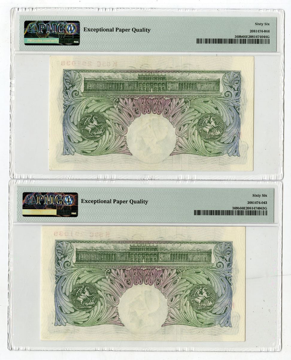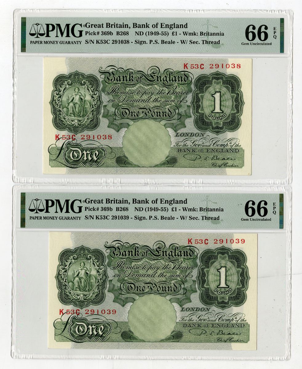 Great Britain, ND (1949-55). £1, P-369b (2) B268, Sequential Pair of Issued Banknotes, Green on blue-gray underprint with seated Britannia at left, Backs are m/c with Parliament building at top and St. George and the dragon at bottom, S/Ns K53C 291038 & K53C 291039, Both notes are PMG graded Gem Uncirculated 66 EPQ. (2). Only 8 notes grade 1 increment higher out of 142 notes graded in the PMG census. A superior sequential graded pair that rarely shows up this nice.