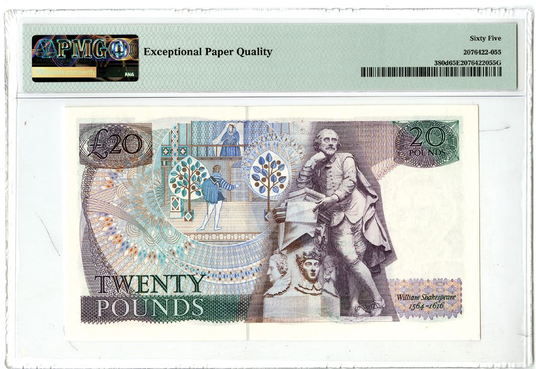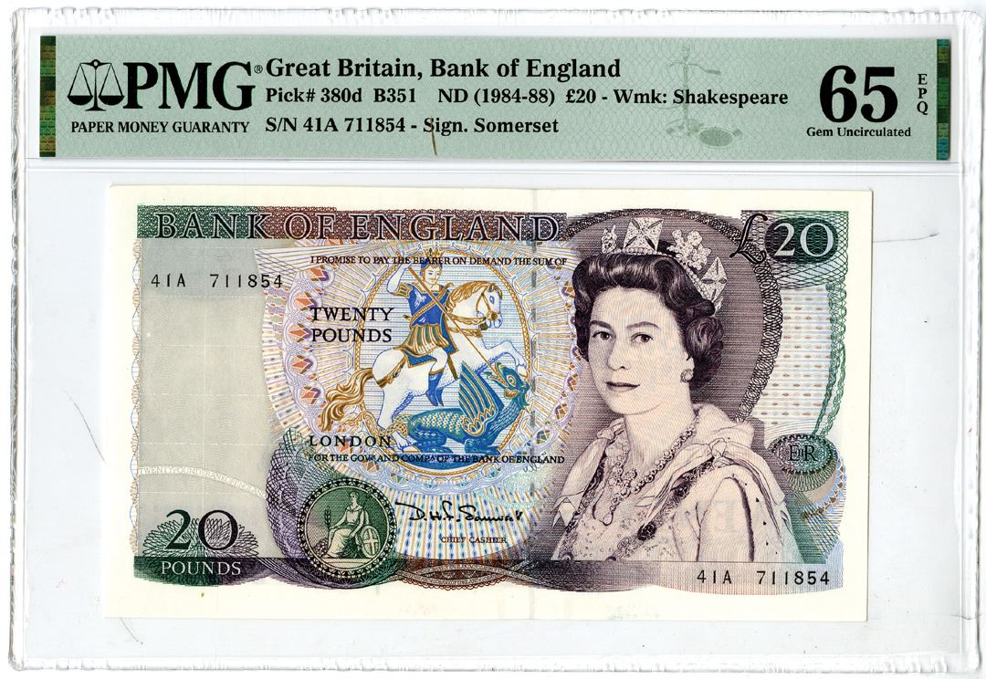 Great Britain, ND (1984-88). 20 Pounds, P-380d, Issued Banknote. M/c printing with young portrait of Queen Elizabeth II at right. S/N 41A 711854. PMG graded Gem Uncirculated 65 EPQ.