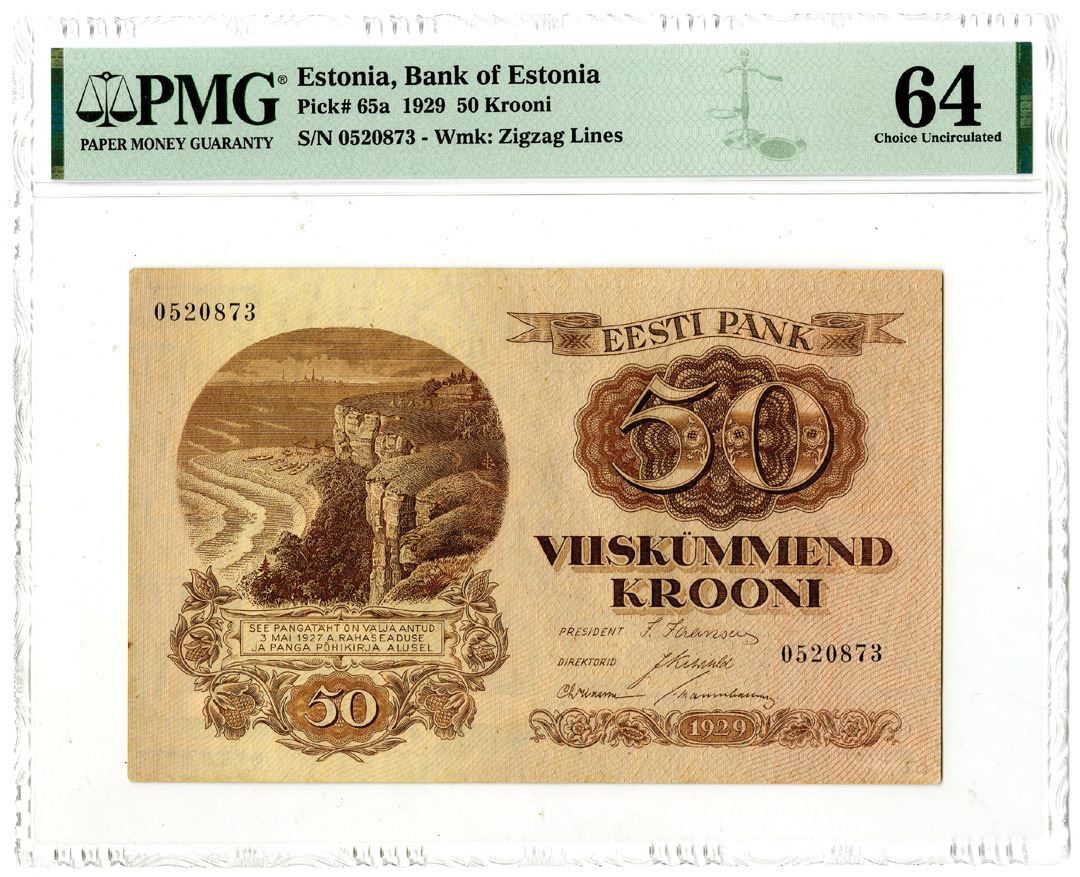Estonia. 1929. 50 Krooni, P-65a, Issued banknote, Brown, S/N 0520873, Watermark: Zigzag Lines, PMG graded Choice Uncirculated 64.
