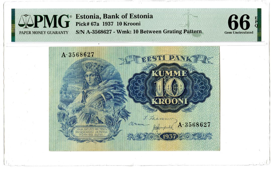 Estonia. 1937. 10 Krooni, P-67a, Issued banknote, Blue, S/N A-3568627, Watermark: 10 Between Grating Pattern, PMG graded Gem Uncirculated 66 EPQ.