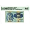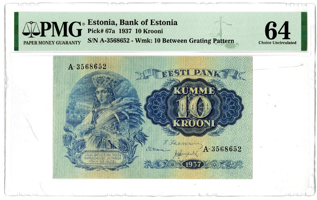 Estonia. 1937. 10 Krooni, P-67a, Issued banknote, Blue on face, S/N A-3568652, Watermark: 10 Between Grating Pattern, PMG graded Choice Uncirculated 64.