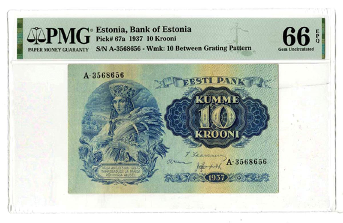 Estonia, 1937. 10 Krooni, P-67a, Issued banknote, Blue on yellow underprint with woman in native clothes and sheaves of grain at left , Back is m/c with denomination at right, S/N A-3568656, Watermark: 10 Between Grating Pattern, PMG graded Gem Uncirculated 66 EPQ.