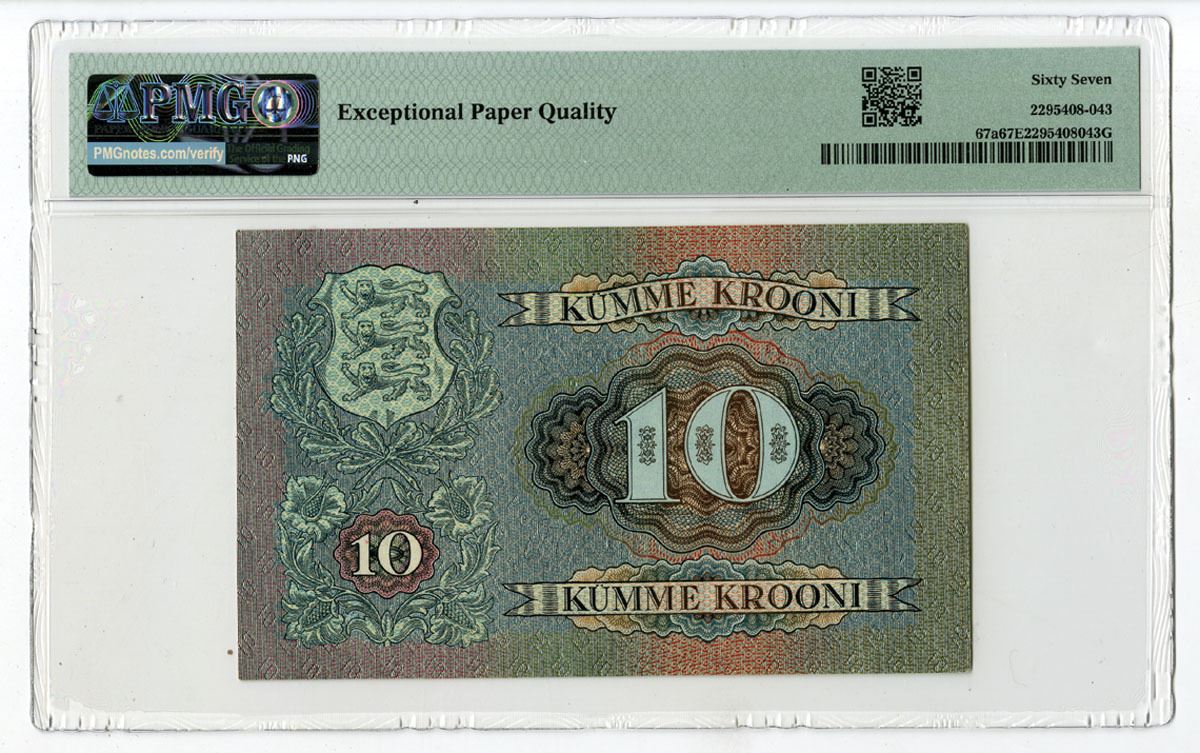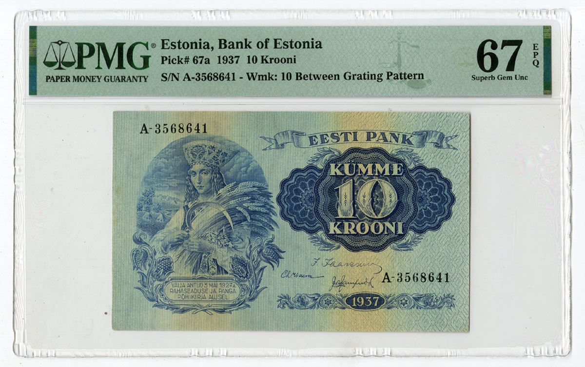 Estonia, 1937. 10 Krooni, P-67a, Issued banknote, Blue on yellow underprint with woman in native clothes and sheaves of grain at left , Back is m/c with denomination at right, S/N A-3568641, Watermark: 10 Between Grating Pattern, PMG graded Superb Gem Uncirculated 67 EPQ.