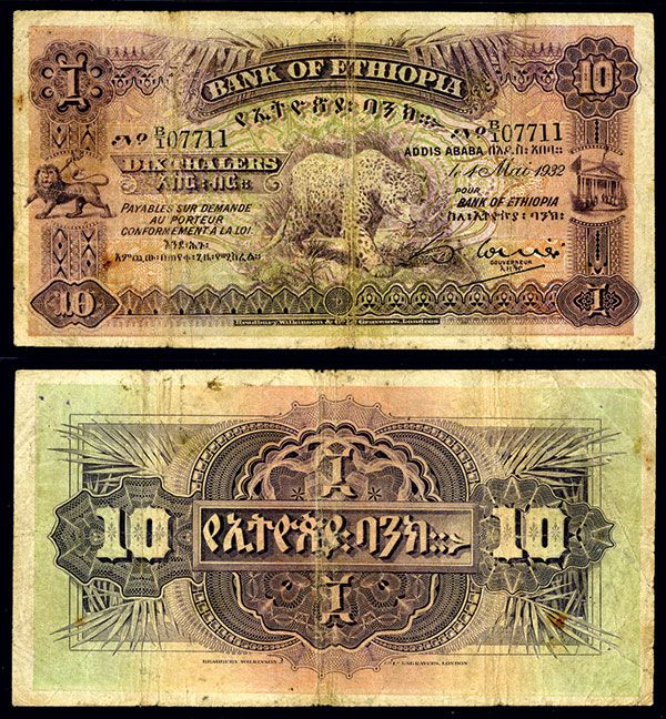 Ethiopia, 1932, 10 Thalers, P-8, Issued banknote, leopard in middle. S/N B/1 07711, PMG graded Choice Fine 15 NET with note of rust on spots on margin. BWC.