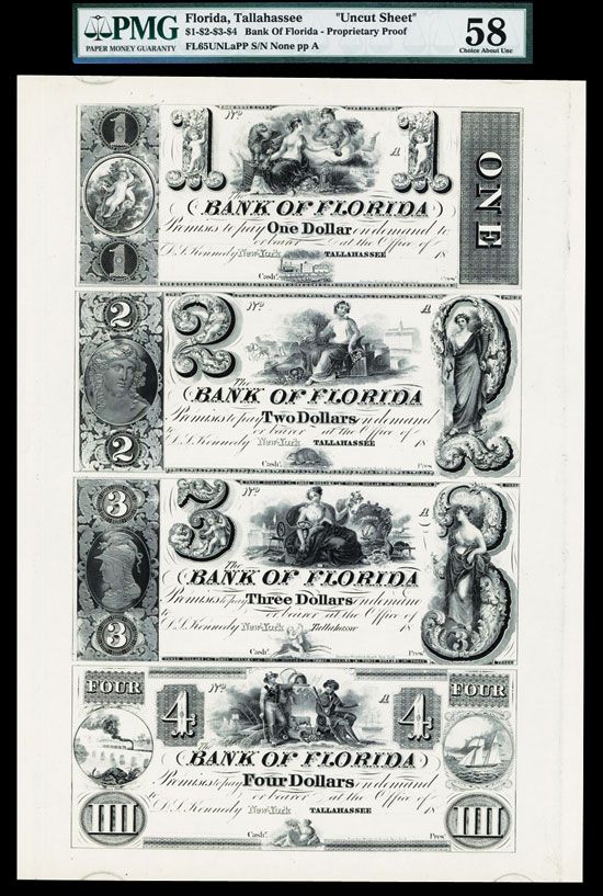 Tallahassee, Florida, Uncut sheet of 4 notes, 18xx (originally printed in 1843-44, these are ca.1960-70's), $1-$2-$3-$4, (FL-65-G20; G22; G23; G24), Revived Bank Issues Payable at the Office of D.S. Kennedy in New York (1843-44), Unlisted Modern ÒProprietary ProofÓ, The $1 note has reclining cherub on left and in numeral ones flanking central vignette of allegorical woman with Mercury and Gryphon; The $2 note has seated ÒProsperityÓ in middle, cameo on left and standing allegorical woman in numeral on right; The $3 note has 2 note has seated allegorical woman with cornucopia in middle, cameo on left and standing allegorical woman in numeral on right; and the $4 note has small locomotive over bridge on left, sailing ship on right and frontiersman and reaper with arms in middle, Black printing with no underprint printed on thin white card, PMG graded Choice About Uncirculated 55. RWH. This is the only uncut sheet from this bank found in the archive. (ABN Commemoratives, AIA XI, May 15, 2012)