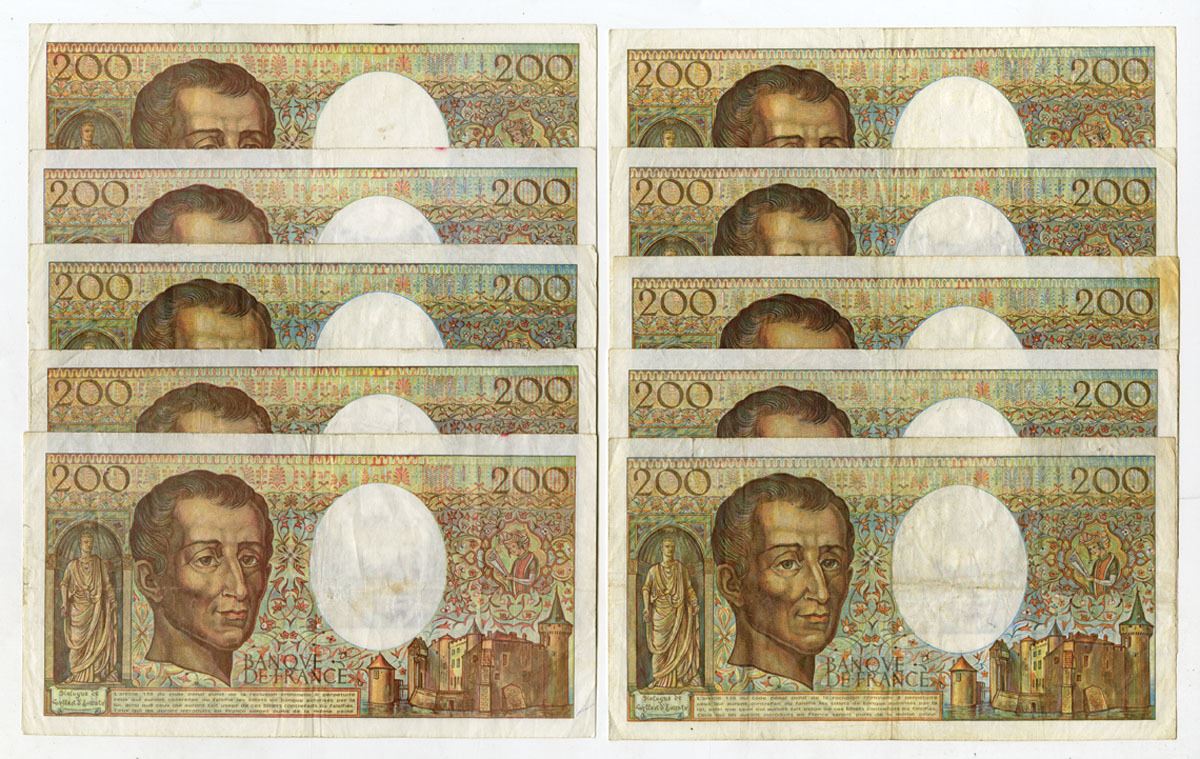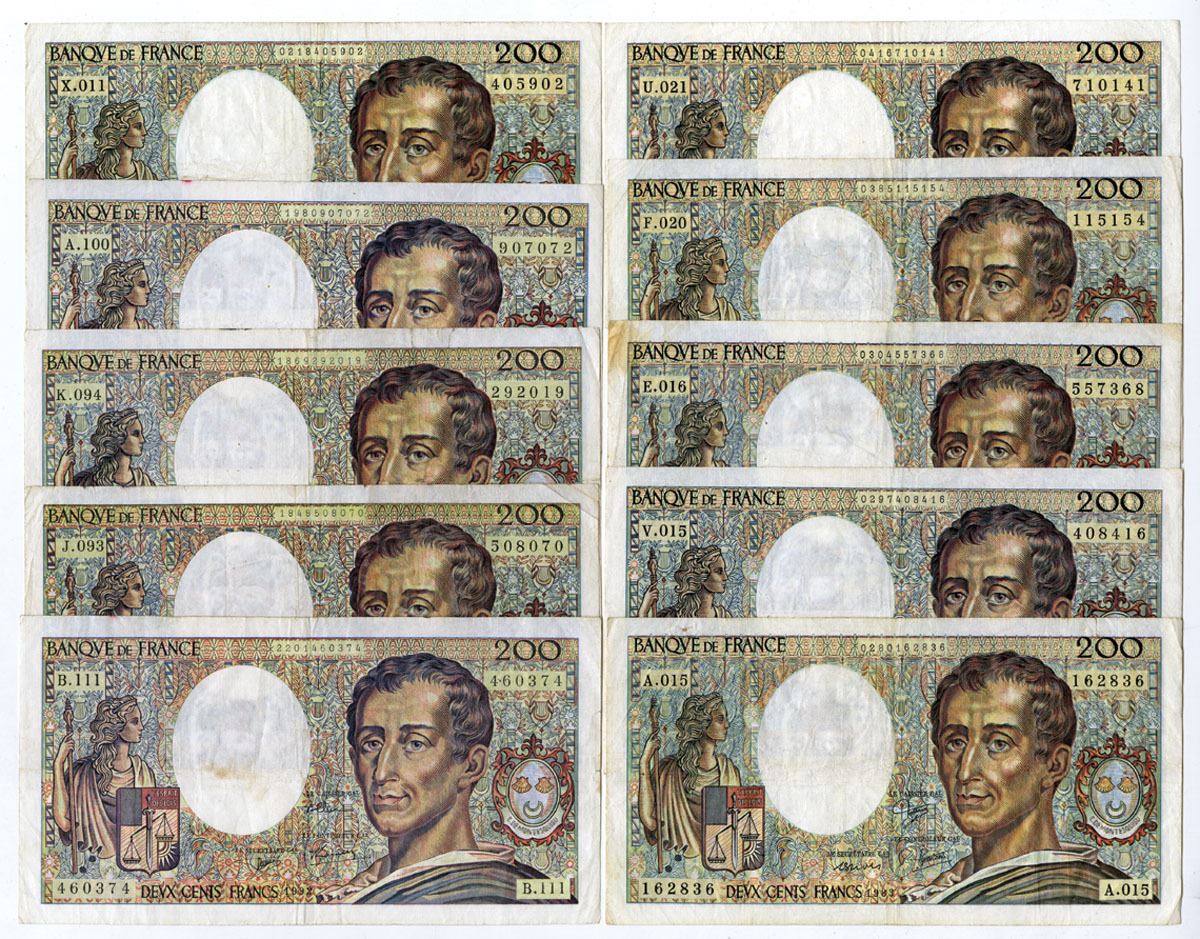 France, 1983-92. Lot of 10 notes, Includes 200 Francs, P-155a (6), P-155d (3), & P-155e, Issued Banknotes, Blue-green with yellow and m/c printing, Figure with staff at left and Charles Baron de Montesquieu at right, Back shows Montesquieu at left and Castle of Labrede at right, Notes range from Fine to VF+ condition. (10). Sold "AS IS" no returns accepted.